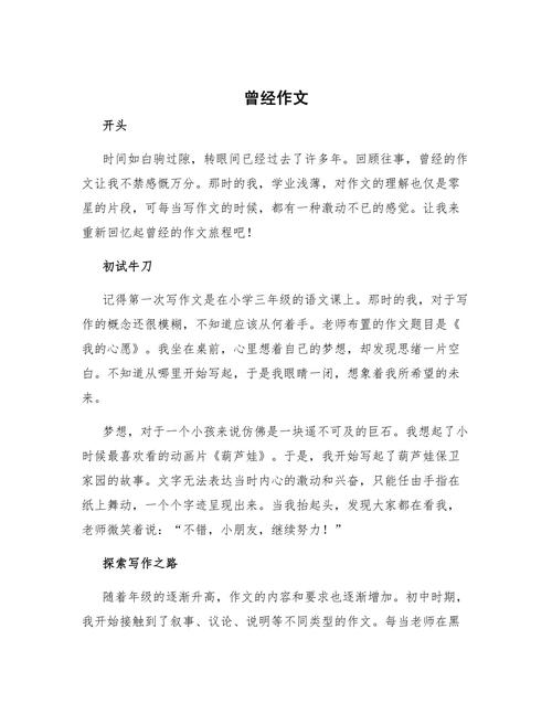开头:以描绘场景和氛围开始,引领读者进入回忆的世界。例如:“阳光透过窗户洒在房间的每个角落,那熟悉的老房子和街道让我瞬间回到了敬没童年。我开始回忆起那些美好的往事。”以情感表达开始,引发读者的共鸣。例如:“每当我看到那张老照片,心中总会涌起一股莫名的感动。