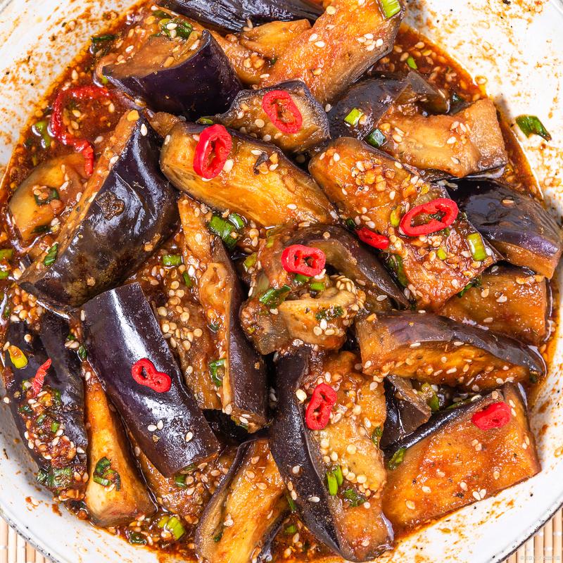 辣椒(可选):少许 步骤:处理茄子:茄子洗净后切成长条或滚刀块,不要去皮(皮富含营养且能保持形状)。将切好的茄子放入清水中浸泡5分钟,防止氧化变黑。去水分:捞出茄子,用厨房纸或干净的布擦干表面水分。这一步很重要,可以减少茄子的吸油性(即使不用油,也能让茄子更易入味)。