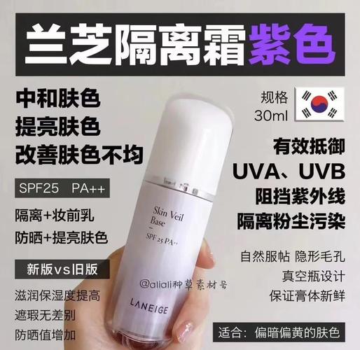兰芝紫隔离和绿隔离的主要区别如下:功效与适用肤质 紫色隔离:主要具有中和黄色的作用,非常适合普通肌肤以及偏黄偏暗的肌肤。使用紫色隔离后,能够明显提亮增白肤色,改善肌肤暗沉和不匀称的问题,使皮肤呈现出健康明亮、白里透红的色彩。