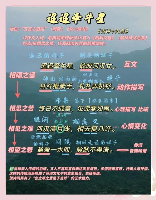 赏析: 背景与主题:此诗写牵牛织女夫妇的离隔,源于中国古代关于牵牛和织女的民间故事。诗中通过描绘这对天上夫妇的离别之苦,展现了深沉的相思之情。 巧妙的语言安排:“迢迢牵牛星,皎皎河汉女”这十个字的安排最为巧妙,既描绘了牵牛星和织女星的遥远与明亮,又隐含了游子的思乡之情和女性的柔美。