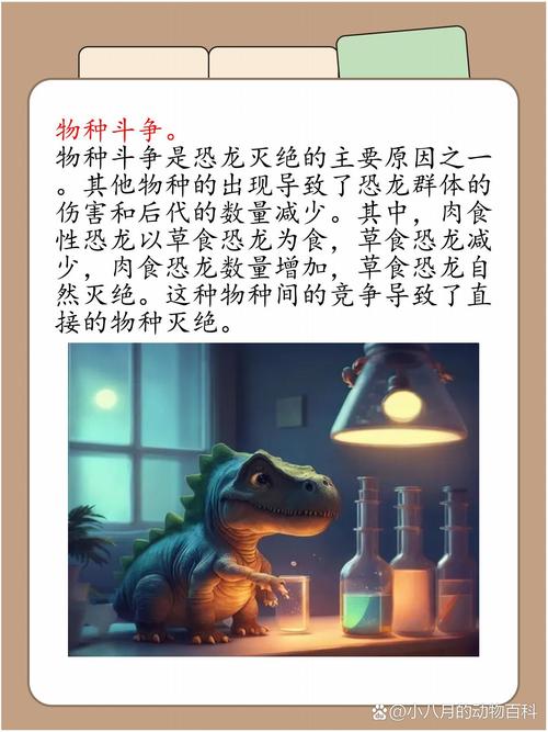 该假说认为,地球气候在6500万年前发生了剧烈变化,气温大幅下降,导致大气含氧量减少,恐龙因无法适应这种变化而灭绝。另一种观点是,恐龙是冷血动物,缺乏保暖器官,无法抵御寒冷气候,因此被冻死。 物种斗争说 该假说认为,小型哺乳类动物在恐龙年代末期出现,并以恐龙蛋为食。