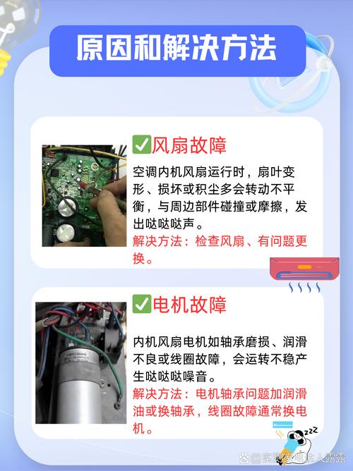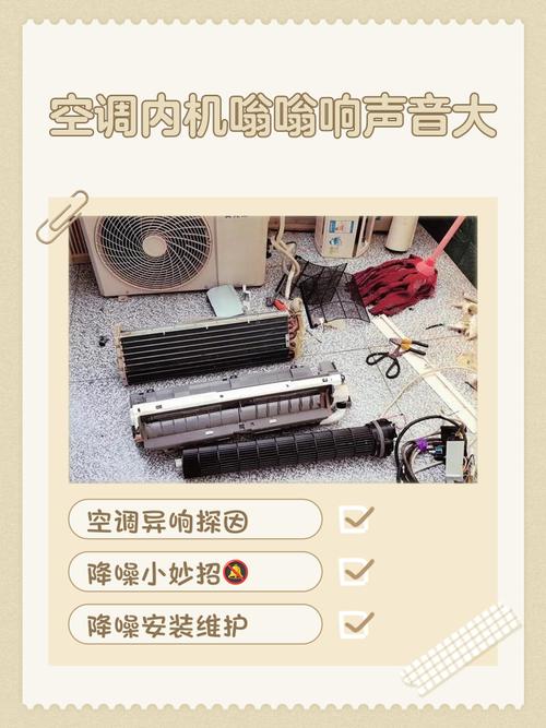 3、解决方法:适当调整空调的温度设置,避免过度制冷或制热,同时减少空调内机的风速以降低噪音。零件损坏:原因:风扇叶片变形或电机故障可能导致噪音增加。解决方法:联系专业的维修人员进行检修和更换损坏的零件。共振现象:原因:空调内机与其他物体产生共振,导致嗡嗡声。