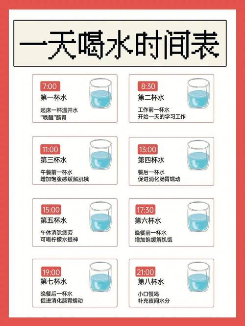 0:第一杯水,有助于排毒养颜。清晨一杯凉白开是最佳选择,可以帮助体内垃圾排泄。8:30:第二杯水,体贴健康。这个时间喝水可以保持身体水分平衡,为一天的工作和生活打下良好基础。11:00:第三杯水,解乏放松。在上午工作一段时间后喝水,可以提神醒脑,缓解疲劳。12:50:第四杯水,减负减肥。