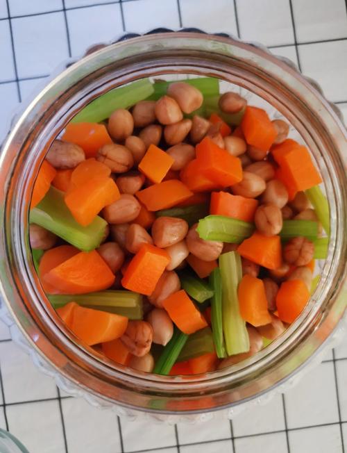 6、制作芹菜腐竹胡萝卜花生米凉菜的步骤如下:准备食材:芹菜:去叶留梗,洗净后切成小段。胡萝卜:去皮洗净,切成小丁。花生米:提前用水浸泡一小时。腐竹:切断后,用油炸至膨胀备用。焯煮食材:在炒锅中加入凉水,放入一小勺盐,水开后先放入胡萝卜丁,焯煮三分钟。接着放入芹菜段,继续焯煮五分钟。