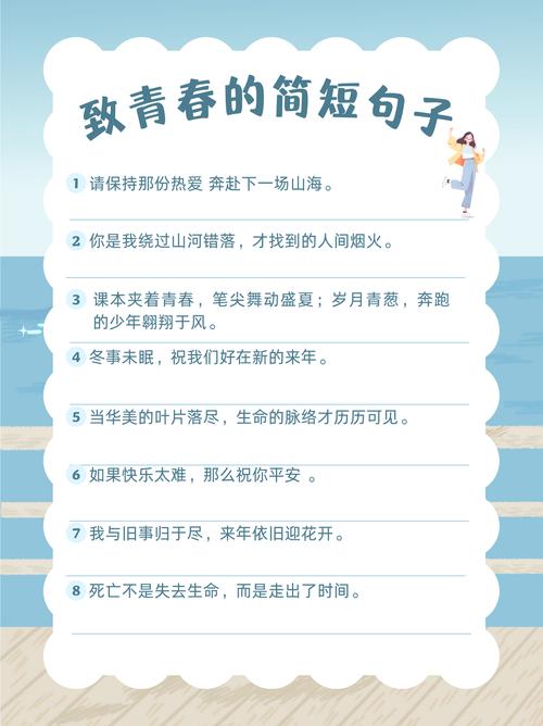 1、好句: 生命在于奋斗,青春因努力而闪耀:强调了青春时期奋斗的重要性,只有通过努力,青春才会焕发光彩。 追逐梦想,永不放弃:激励人们坚持自己的梦想,无论遇到多少困难都不应轻言放弃。 生活中没有捷径可走,唯有不断努力才能成就自己的未来:提醒人们成功没有捷径,只有通过持续的努力才能取得成就。