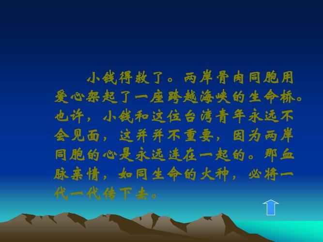 4、一代一代传下去是指:两岸同胞相距虽远,心却是紧紧相连的,而且这种亲情是经久不熄,世代相传。这里的“生命桥”不是现实生活中实实在在的桥梁,是两岸人民用亲情建立起的感情的桥梁,而且这座用爱心架起的生命桥一定会永远屹立在两岸同胞的心中。