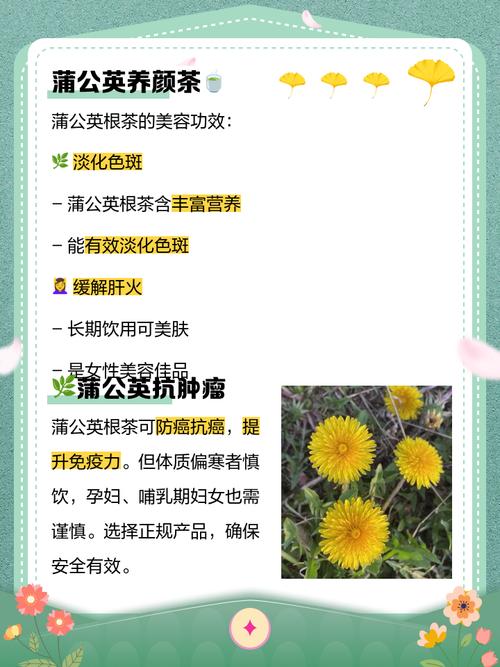 4、蒲公英茶对肝脏有益。蒲公英茶有助于保护肝脏,清除体内的毒素,对预防肝损伤特别有帮助,尤其是对经常饮酒的人来说。 蒲公英茶有助于美容养颜。蒲公英茶可以预防妇科疾病,减轻皮肤斑点,改善毛孔粗大问题,并缓解皮肤瘙痒,同时具有清热解毒的作用。 注意事项:- 脾胃虚寒者应避免饮用。