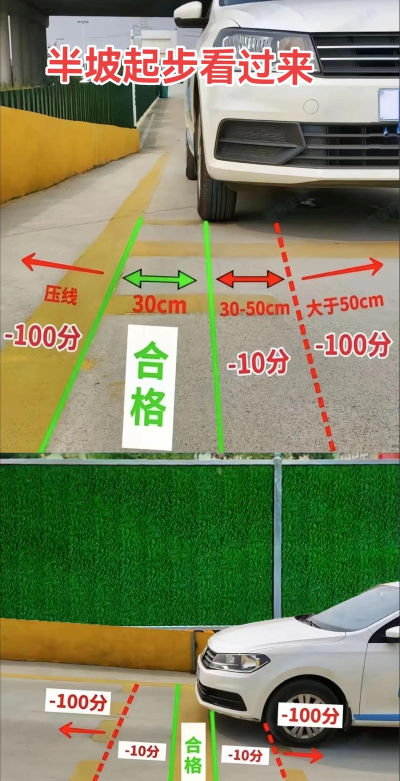 4、坡道熄火扣20分。停车后超过30秒未启动视为不合格。距离判断(右边线):车辆与道路边缘线的距离小于30厘米且不压线,不扣分。车身距离边缘线超过30厘米但未超过50厘米,扣10分。车身距离边缘线超过50厘米,判定为不合格。