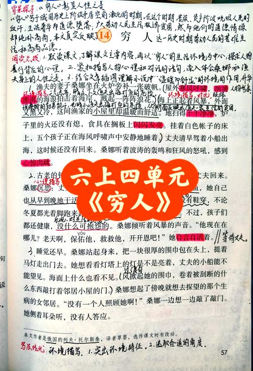 六年级上册语文第 14 课《穷人》是一篇描写贫困家庭生活的小说。在这篇文章中,作者通过细致入微的细节描写展现了穷人的艰辛生活。以下是一些具体的细节描写:家庭环境:文章描述了穷人的住处,一间简陋的小屋,屋内摆设简单,破旧的家具、被褥等生活用品体现出家庭的贫困。