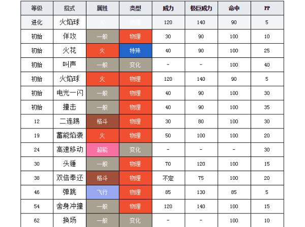 5、攻击类:火焰牙:攻击目标造成伤害。火焰牙有10%的几率使目标陷入灼伤状态。火焰牙有10%的几率使目标陷入畏缩状态。劈开:攻击目标造成伤害。击中要害率比普通招式高1级。闪焰冲锋:攻击目标造成伤害。使用者承受对目标造成伤害的13的伤害。