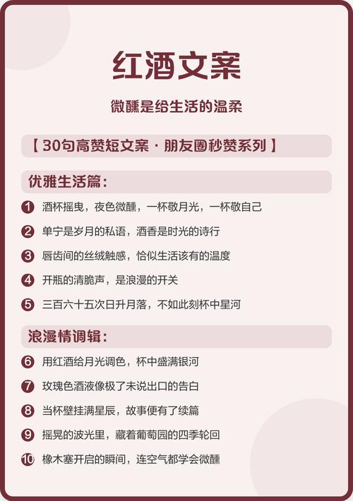 强调红酒的浪漫与优雅 文案示例:“摇曳的红酒杯,醉人的夜。一杯红酒,不仅是一种饮品,更是一种生活态度的展现。它带着法式的浪漫与优雅,让人沉醉其中,忘却烦恼。今晚,让我们一起品味这份独特的美好吧!” 分享品酒体验 文案示例:“生活就像一杯红酒,需要细细品味。