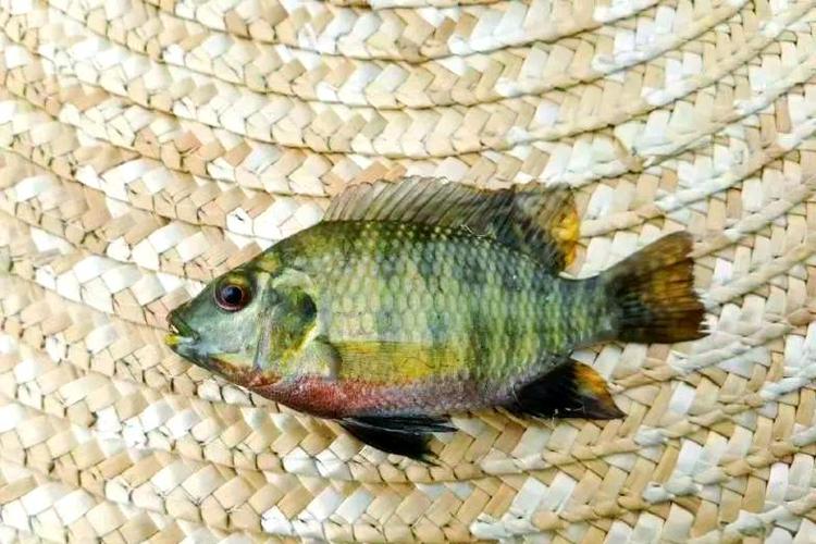 3、如图所示,齐氏非鲫,学名Tilapia zillii,属于慈鲷科(Cichlidae)的非鲫属鱼类。这种鱼体侧扁平,背鳍后方的特征是一块黑色斑点,整体呈现棕绿色的虹彩光泽。腹部前端呈红色,体侧有8至9条横纹,尾鳍为截形。