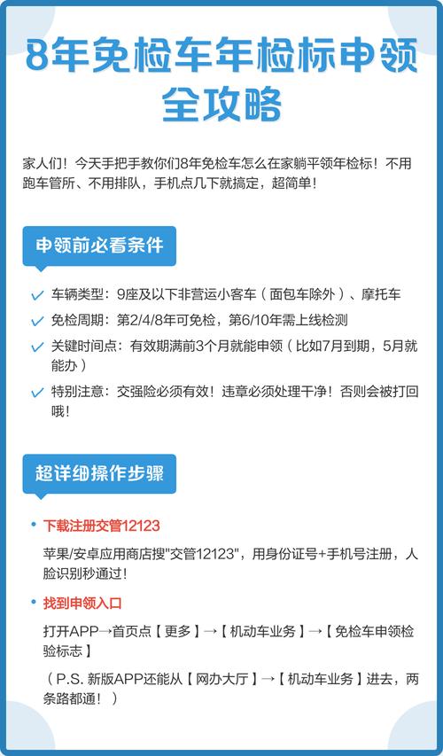 1、如何在六年免检期间领取检验标志 对于六年免检车辆的检验标志领取,有以下途径可供选择:途径一:专业汽车检验公司 您可前往正规的汽车检验有限公司,他们会提供详尽的汽车检验服务,并在检验合格后颁发检验标志。在过程中,请确保携带车辆的相关证件,如行驶证和车主身份证,同时缴纳相应的检验费用。