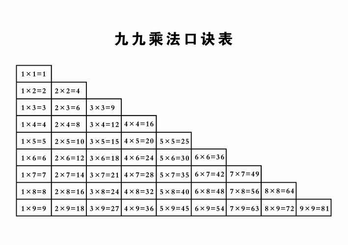 起源时间:九九乘法表的历史可以追溯到两千多年前,是中国古代数学文化的重要组成部分。古代应用:在古代,九九乘法表被广泛应用于商业、农业、天文等领域的计算中,极大地提高了计算效率。名称由来 口诀顺序:古时的乘法口诀是从九九八十一开始,一直念到一一如一为止,与现在使用的顺序相反。