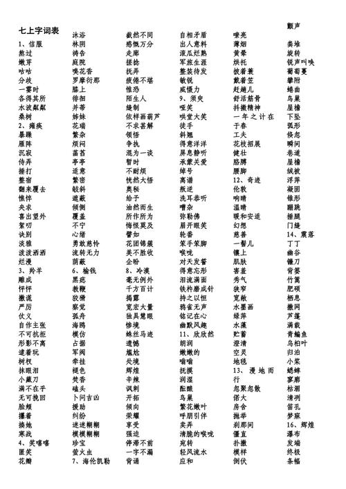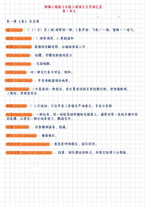 2、七年级上册语文,第一单元,词语学习包括痴想、诱惑、一瞬等词汇。第二单元中,词语如缀连、脊梁、洗濯等,让学生加深理解。第三单元词语如酝酿、黄晕、抖擞等,让学生感受自然之美。第四单元词汇如骸骨、葱茏、窥见等,引导学生关注自然。第五单元词语如丫杈、憔悴、诀别等,涉及情感与人生哲理。