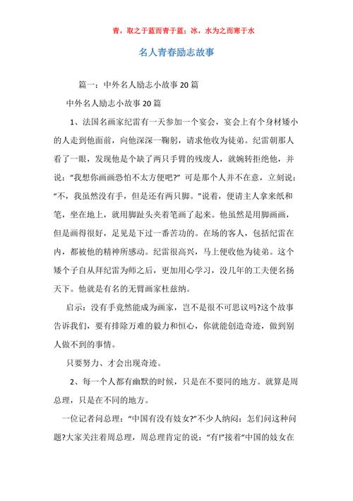 3、青春是在它即将逝去的时候最具有魅力。以下是我为大家整理的关于名人 青春励志 故事 ,欢迎阅读!名人青春 励志故事 1:约翰逊 约翰逊博士,他的父亲经营一个大旧书摊。有一次,距离不远处有个节目,大家都去赶集,这天正下着雨,他的父亲想要约翰博士分一部份书籍,运到赶集的地方去贩卖。