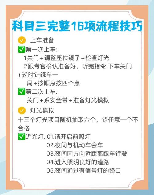 6、在准备科目三考试时,建议考生多加练习,熟悉考试路线,了解交通规则,提高应对突***况的能力。同时,保持良好的心态,避免紧张和焦虑情绪,这对于顺利通过考试至关重要。考试当天,考生应确保自己充分休息,保持良好的精神状态。考试时,要保持冷静,严格按照考试流程进行操作。