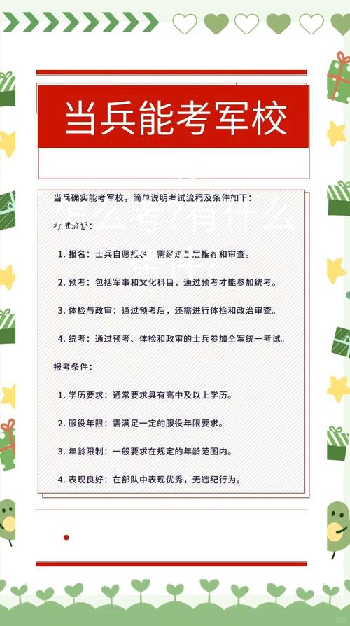 3、考上大学后可以去当兵。以下是关于大学生当兵的详细解政策允许 根据相关政策,大学生在考上大学后,只要身体条件符合招兵要求,是可以选择去当兵的。服兵役是公民的应尽义务,国家鼓励符合条件的大学生积极参与。