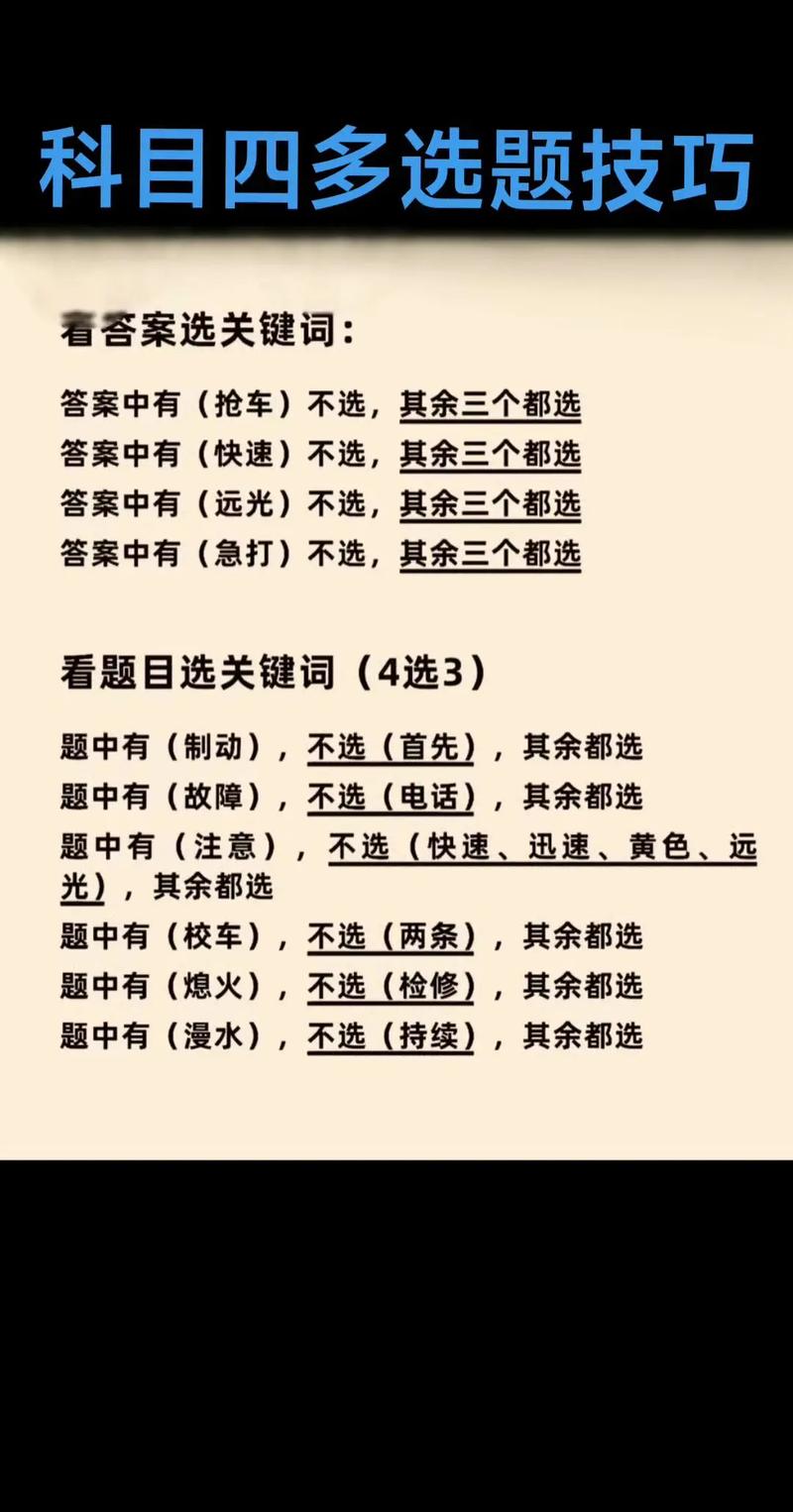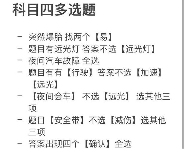 科目四多选题有5道。以下是关于科目四考试多选题部分的详细解多选题数量 科目四考试试卷共由50道题组成,其中最后5道题是多项选择题。这意味着考生在完成前45道单项选择题后,将面对5道需要选择多个正确答案的多选题。