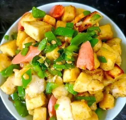 5、倒入煎好的馒头丁,大火快速翻炒均匀,加入适量盐、鸡精调味,根据口味可加少许生抽提鲜,翻炒均匀后即可出锅。