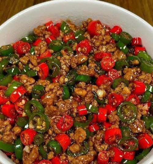 1. 肉沫用料酒、盐、胡椒粉和淀粉腌制10分钟。青红椒切小丁。