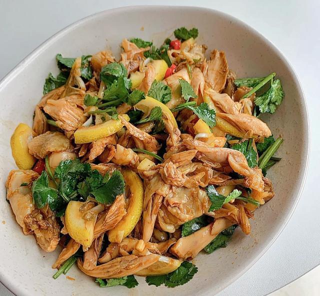 3. 徒手把鸡腿撕成条,黄瓜切丝垫底,撒上香菜段、蒜末、小米辣圈。