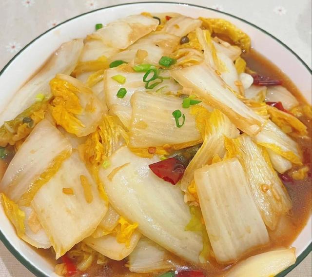 5. 加入白菜叶继续翻炒20秒,叶片稍软时沿锅边淋入调好的醋汁,锅温瞬间激发醋香。