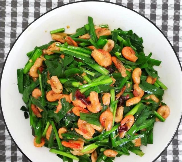 材料:韭菜 200 克、虾仁 150 克、生姜、盐、食用油适量。