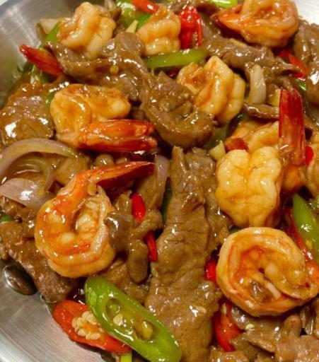6. 混合食材:将之前炒好的虾仁和牛肉倒回锅中,快速翻炒均匀。加入少许黑胡椒粉调味,若需要可以适量再加入生抽和盐,调整口味。