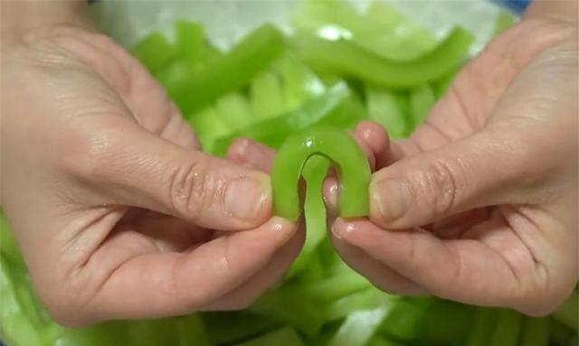 3.这就是已经杀水后的效果,出来很多水分,再用流水冲洗干净,把水分挤干,这样腌制以后的莴笋比较软,轻轻就能折过来,而且不会断。