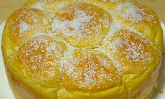 7.现在蒸的面包时间到了,关火焖五分钟再开盖,闻着好香,上次蒸的面包很多朋友不相信是蒸出来的,看一下这个效果怎么样,前面的步骤做好了,脱模也是很轻松的,最后可以在表面刷一层蜂蜜水,再撒上一层椰蓉就可以开吃了。