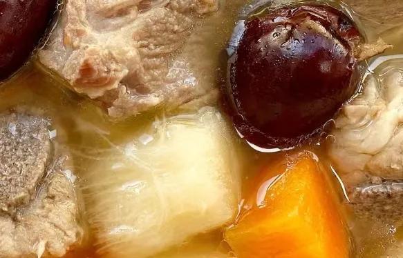 4、时间到,再放入苹果和红枣,继续炖煮二十分钟。煮好后,加入食盐调味,搅拌均匀煮至入味,即可出锅开吃。