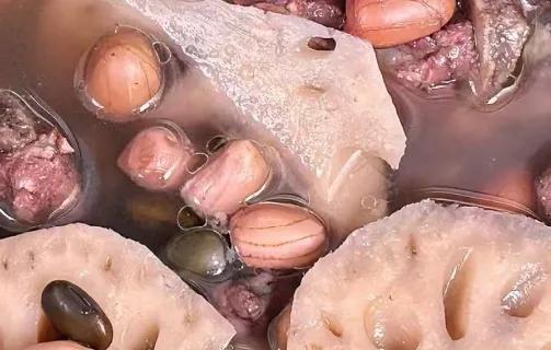 3、将鸡肉、莲藕、花生和姜片放入汤锅中,加入足量的清水,盖上盖子炖煮一个小时。