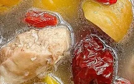 3、将乌鸡、山药、红枣和姜片放入汤锅中,加入足量的清水,盖上盖子炖煮五十分钟。