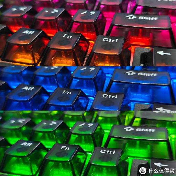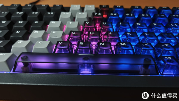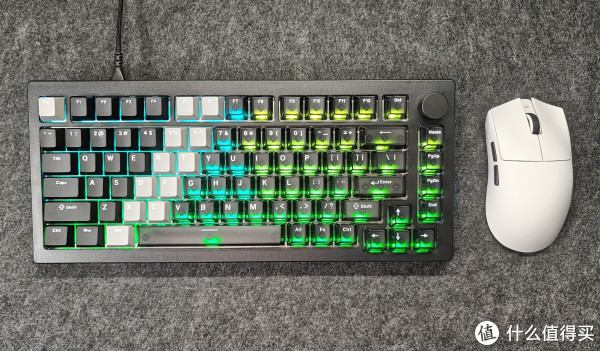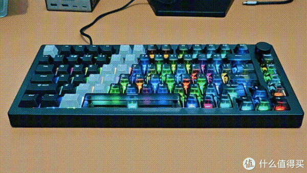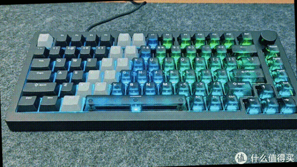 这次我选择的是黑色,平常看起来很内敛,但是给点灯光就会很灿烂那种。Akko 5075V3最吸引我的就是它的双拼色键帽设计——PBT二色注塑搭配PC高清丝印透光材质,不仅触感细腻,透光效果也非常均匀。