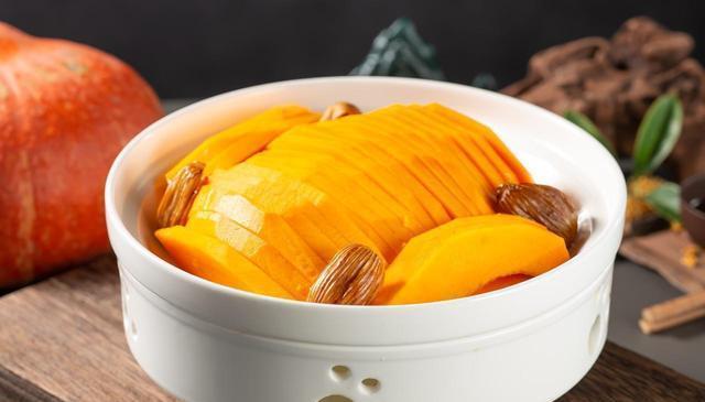 所需食材:老南瓜400 g(板栗南瓜更佳)、新疆若羌红枣8颗、枸杞5 g、蜂蜜15 mL、干桂花1 g、清水30 mL。