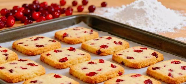 - 步骤:黄油软化后加入白糖搅匀,分两次加入鸡蛋液拌匀,筛入低筋面粉,加入蔓越莓干揉成面团,搓成条冷冻30分钟后切片,摆入烤盘,上下火170℃烤15-18分钟。
