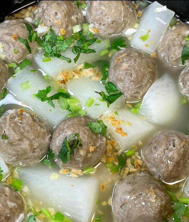 取牛骨熬制的高汤为底,加入白萝卜片慢炖至透明,待汤色清澈见底时,放入手工捶打的牛肉丸。