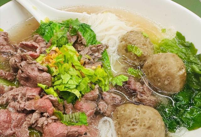 烫粿条10秒,烫生菜5秒,烫牛肉丸1分钟,最后浇入滚烫的牛骨汤。