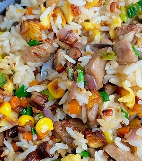 将丸子切丁后与隔夜米饭同炒,加入配菜,临出锅前沿着锅边淋入生抽,激发出镬气。