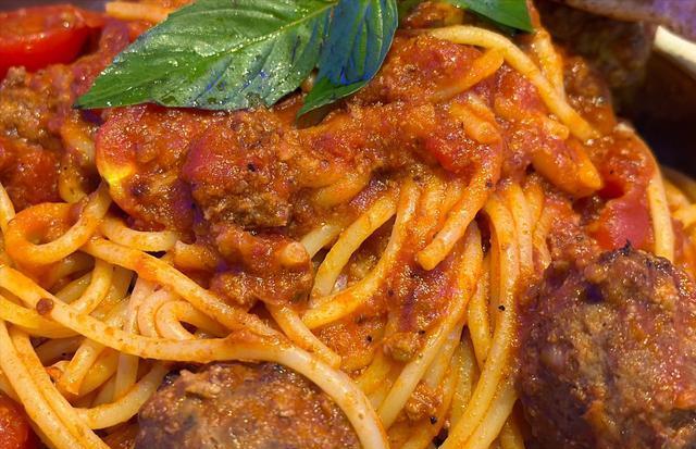 用橄榄油爆香蒜片,放入对半切开的牛肉丸煎至上色,倒入番茄罐头熬成酱汁,最后拌入煮至八分熟的意大利面。