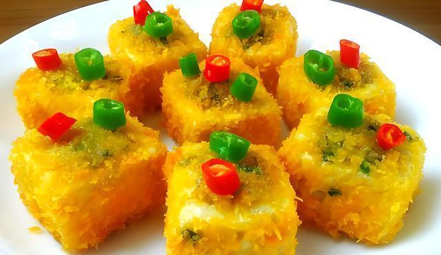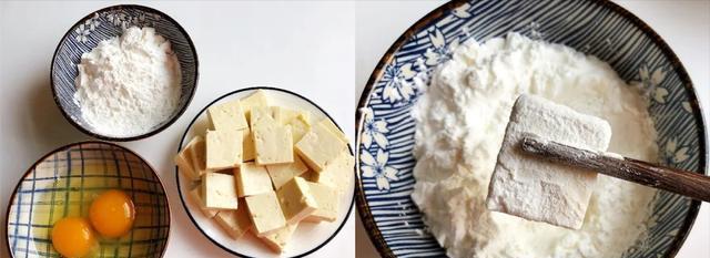 3、沾好淀粉的豆腐,再放到鸡蛋液里裹一裹。这样能让淀粉更好地附着在豆腐上,还能让煎出来的豆腐颜色更金黄诱人。把裹好鸡蛋液的豆腐一块块地放进热油锅里。中火刚刚好,能让豆腐慢慢煎出脆皮。