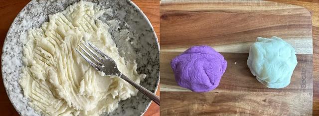 3、接下来,咱把压碎的山药面团分一部分出来,往里面加点紫薯粉。要是没有紫薯粉也没事儿,有啥果蔬粉都能加,像菠菜粉、南瓜粉啥的都行。要是实在没有果蔬粉,不加也行。加了紫薯粉之后,咱就有了两种颜色的面团,白白的和紫色的,可好看了。然后把白色和紫色的面团都分成 20 克左右的小剂子。再把一个白色小剂子和一个紫色小剂子揉在一起,搓成一个小圆球。