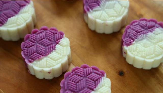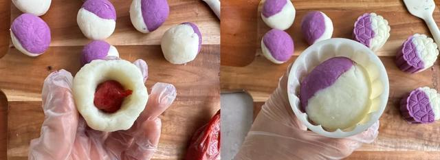 5、咱再准备一个 50 克的月饼模具,在模具里提前刷上一点食用油,这样等会儿就不容易粘模具了。把包好草莓酱的小团子放进模具里,轻轻一压,漂亮的花纹就出来了。一个个山药草莓流心糕就成型啦。