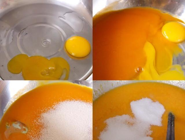 1、先找个盆,把鸡蛋打进去,接着把南瓜泥也倒进去,再加入酵母、细砂糖和玉米油。然后就用筷子或者勺子使劲搅拌,搅好之后,把面粉慢慢倒进去,接着就开始揉面团,揉好面团后,给它盖上保鲜膜,让它安安静静地发酵。