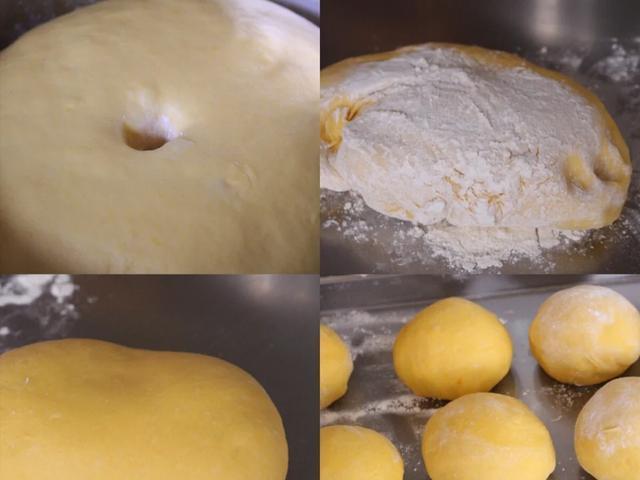 2、等面团发酵好了,就把它拿出来继续揉一揉,接下来,把面团分成 10 份,每份都揉成圆滚滚的。