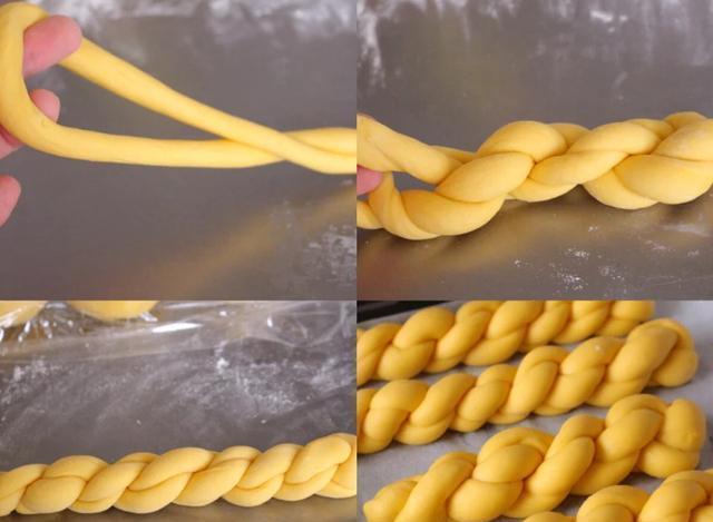 3、拿一个揉好的面团,把它搓成长条,就像搓麻绳一样。搓好后对折一下,然后两手分别拿着两头,向相反的方向拧,就像拧毛巾那样。拧好之后再对折一次,接着再拧,最后拧成一个漂亮的麻花形状,把收口的地方捏紧,别让它松开了。就这么一个一个地把所有面团都做成麻花。