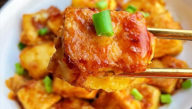 5、用铲子轻轻地翻炒几下,让豆腐均匀地裹上料汁。接着就小火慢慢收汁,等料汁变得浓稠,紧紧地裹在豆腐上,这道香煎脆皮豆腐就算大功告成啦。