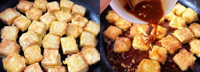 4、等煎到两面都变得金黄酥脆,就像穿上了一件金黄色的铠甲,这时候豆腐的香味已经扑鼻而来啦。这时候就可以把刚才调好的碗汁倒进去啦。碗汁一倒进去,锅里就滋滋作响,香味瞬间更浓郁了。
