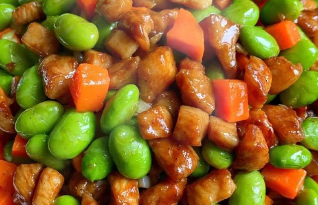 准备食材: 毛豆、胡萝卜丁、鸡胸肉、蒜末、胡椒粉。